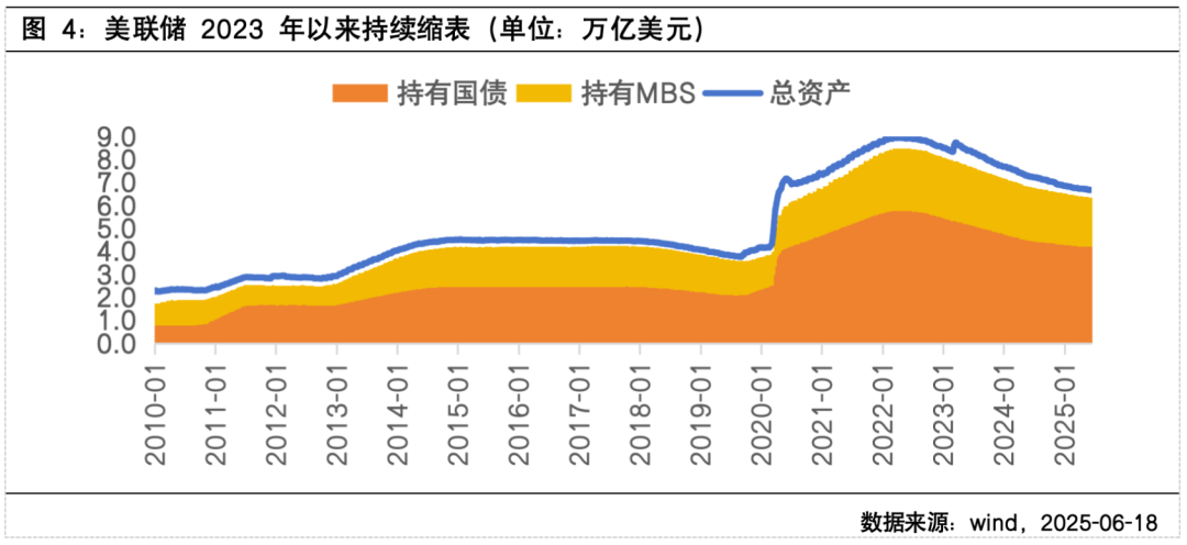 另一方面,美联储是否会转向扩表也将是重要关注窗口。中期看,随着美联储缩表的持续进行,美国总体流动性日渐减少。2025年3月议息会议后,美联储已谨慎放缓缩表步伐,从每月600亿美元下降至400亿美元。若后续财政债务发行大幅增加,美联储可能不得不再度扩表放出流动性,提振美债市场。